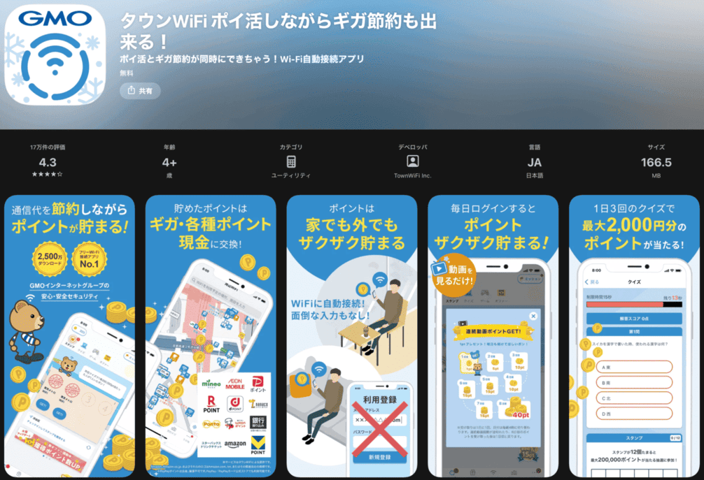 さらに、タウンWiFiはフリーWi-Fiに接続することでポイントが貯まる「ポイ活」も可能です。通信量を節約しながらお小遣い稼ぎもできるため、ギガ不足に悩んでいる人は、ぜひご活用下さい。